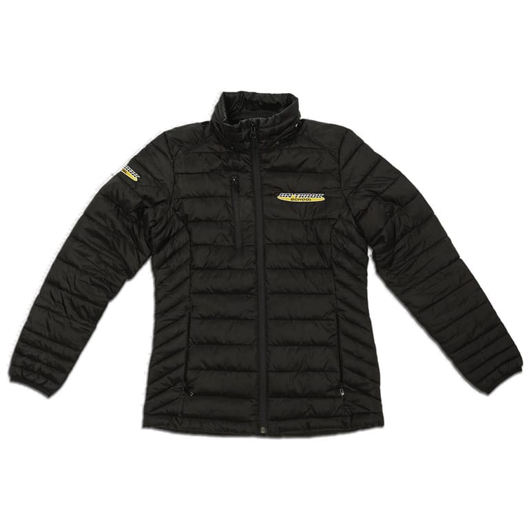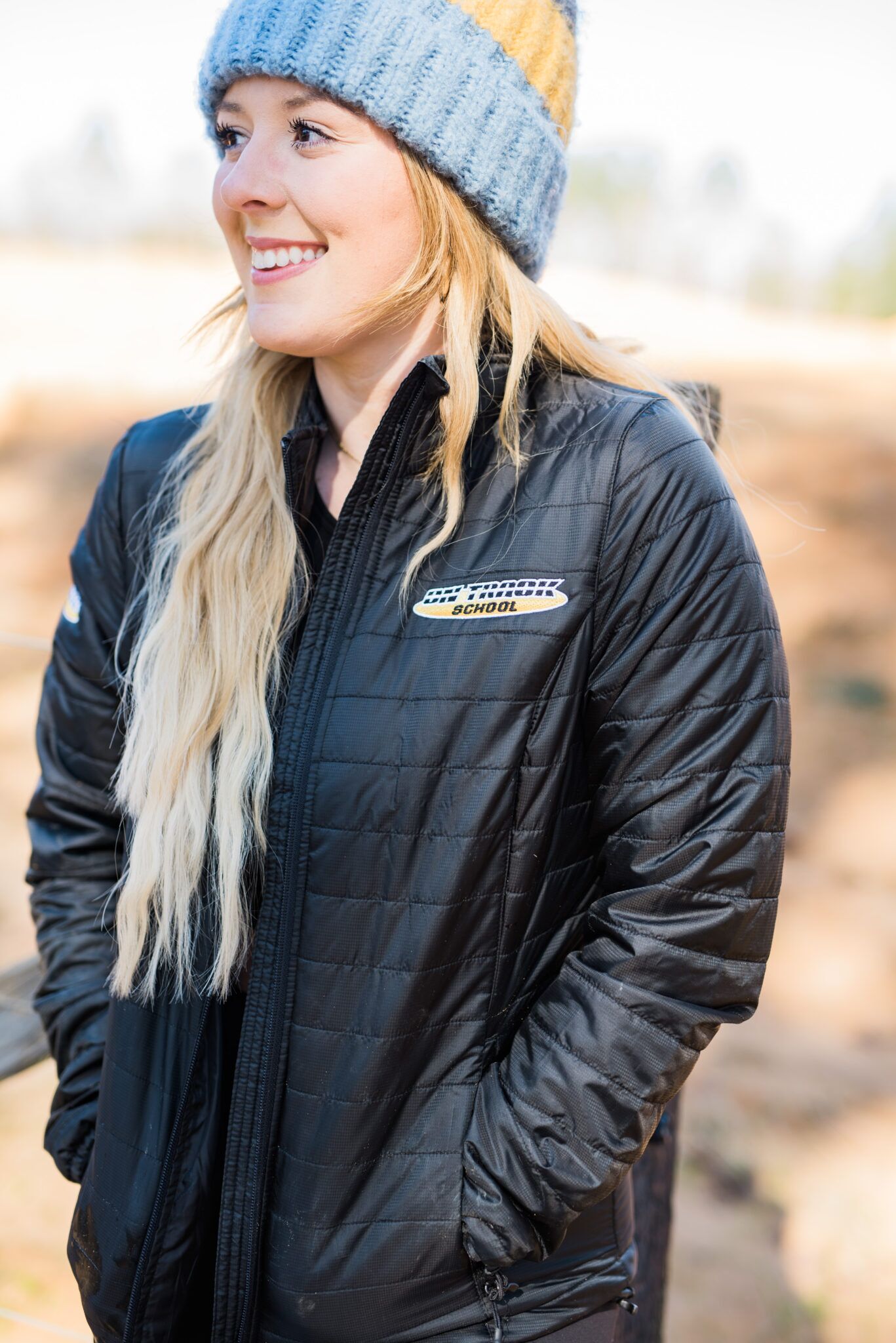 A water-resistant quilted jacket with removable snap hood. Made from 100% polyester and temperature rated at 5-50 degrees F. Full zip style with zip front pockets, right chest pocket, elastic binding at cuff and drawcord at hem. 4″ embroidered On Track School logos on upper left chest and upper right arm.
