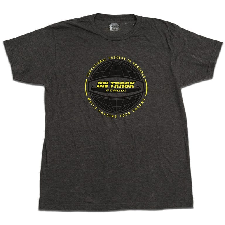 This is a crowd favorite classic 100% cotton tee in Heather Grey. This very comfortable tee is perfect for the race track, a quick work out at the gym or a night out on the town. 10″ silk-screened On Track School international Globe logo on front and 4″ On Track School logo on the upper back.